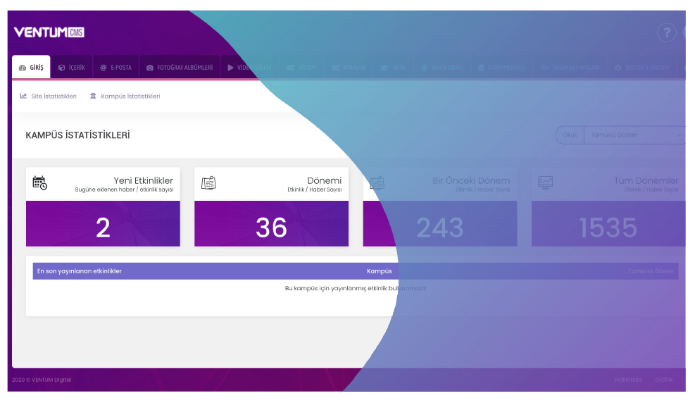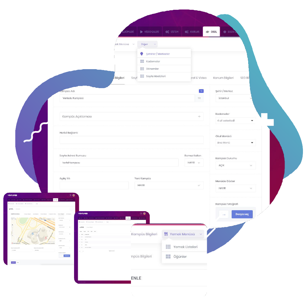 Ventedu, çok kampüslü eğitim kurumlarına yönelik oluşturulmuştur. Bu yüzden ister 10 ister 100 kampüsü web sitenizde kolayca düzenleyebilir veya yeni kampüslerinizi kolayca ekleyebilirsiniz.