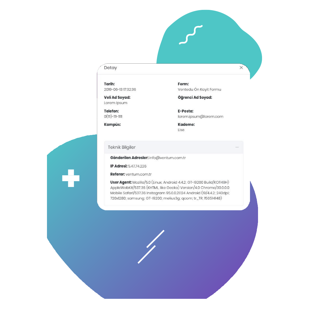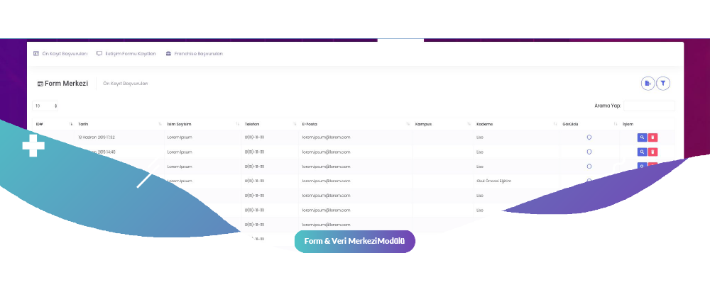 Form & veri merkezi modülümüz ile ön kayıt formları, iletişim formları, franchise başvuruları, sınav başvuruları gibi bir çok veriyi tek bir yerden kontrol etmenizi sağlar. Böylelikle kurumunuzun pazarlama performansını daha sağlıklı yürütebilirsiniz.