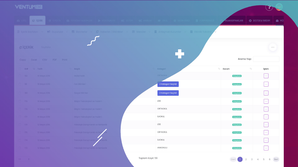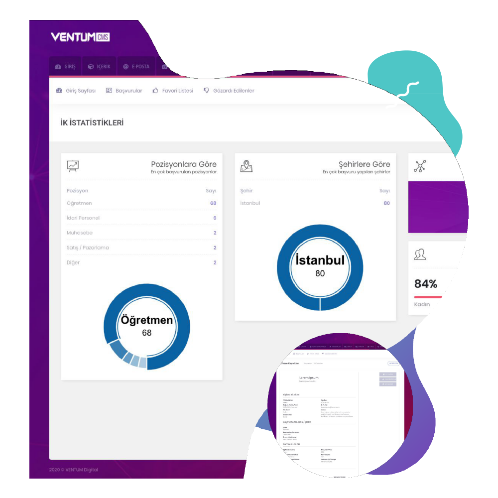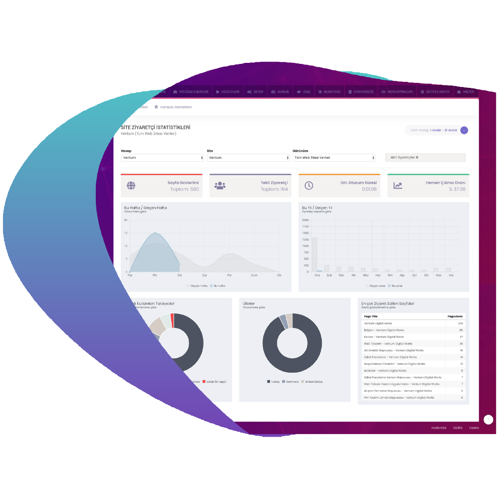 Ventedu, kurumların web sitesi iletişim süreçlerini yürütürken, her türlü raporlama, pazarlama ve içerik gereksinimlerini de yazılımsal olarak üstlenmektedir.