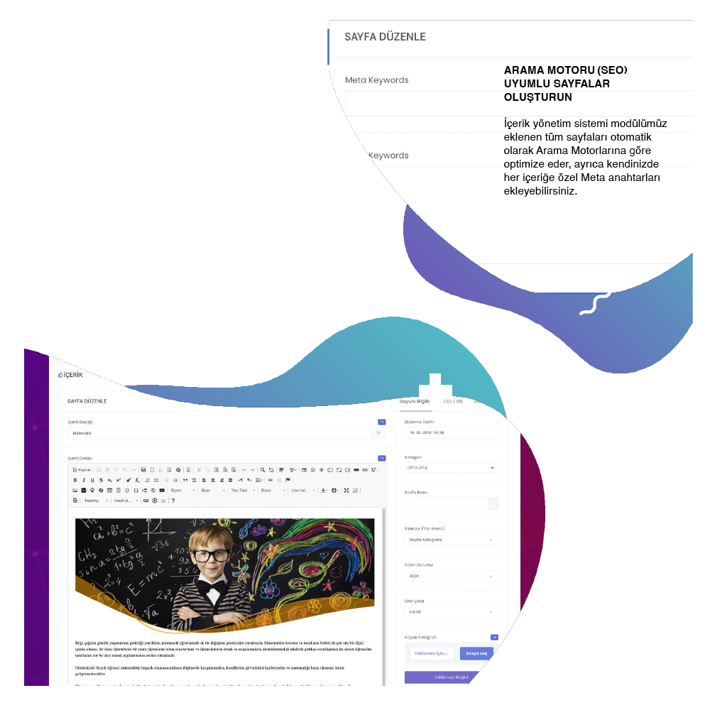 İçerik yönetim sistemi modülümüz eklenen tüm sayfaları otomatik olarak Arama Motorlarına göre optimize eder, ayrıca kendinizde her içeriğe özel Meta anahtarları ekleyebilirsiniz.